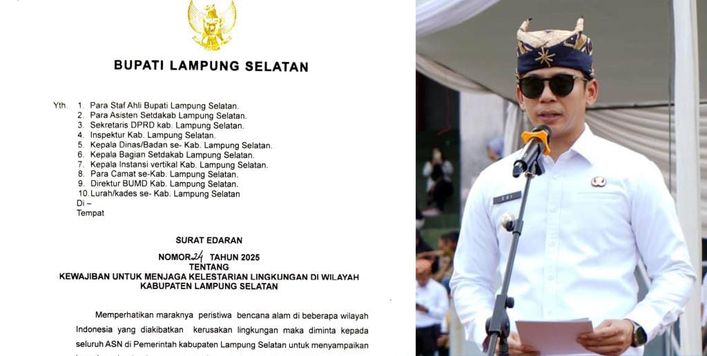 Lampung Selatan, zona-pantau.com — Bupati Lampung Selatan, Radityo Egi Pratama, resmi mengeluarkan Surat Edaran Nomor 24 Tahun 2025 tentang Kewajiban Menjaga Kelestarian Lingkungan Hidup di wilayah Kabupaten Lampung Selatan, Senin (29/12/2025).