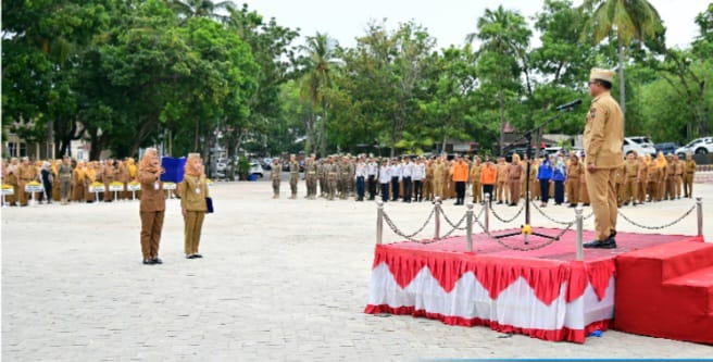 “Ingatlah, jabatan boleh tinggi, tetapi pelayanan harus tetap rendah hati,” ujar Darmawan selaku Pembina Apel saat membacakan amanat Bupati.